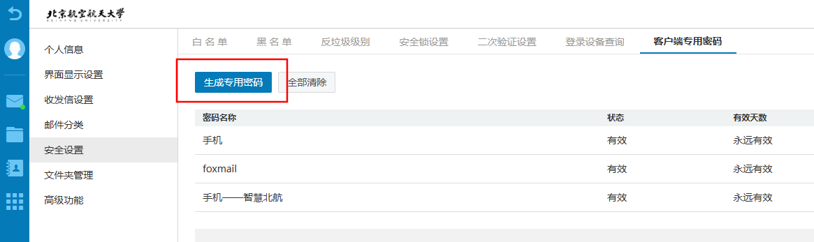 客户端专用密码:使用邮件客户端连接邮箱使用时,为适配二次验证,使用邮件客户端((如 Foxmail、Outlook 等)时,需在邮件系统中单独配置并使用客户端专用密码。