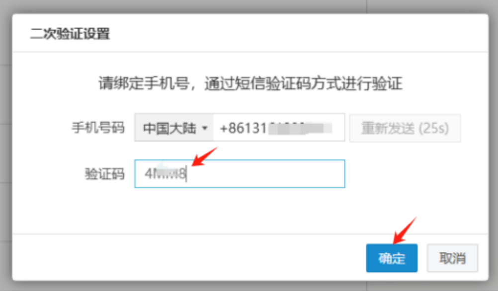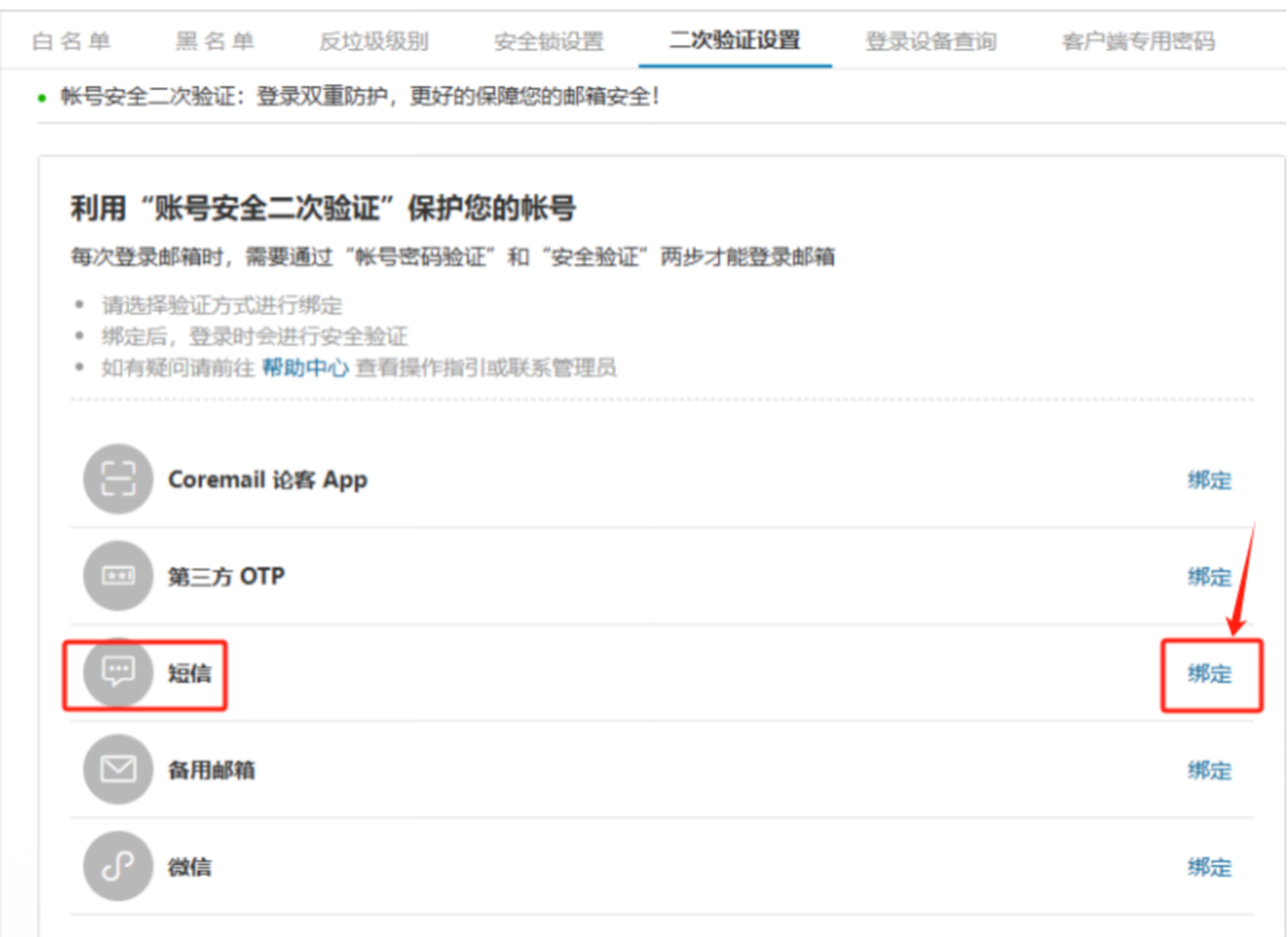 2.完成手机号绑定:点击下方短信选项对应的“绑定”按钮,在弹出的窗口中输入手机号码,点击“发送验证码”并输入手机收到的短信验证码,点击“确定”即绑定成功。
