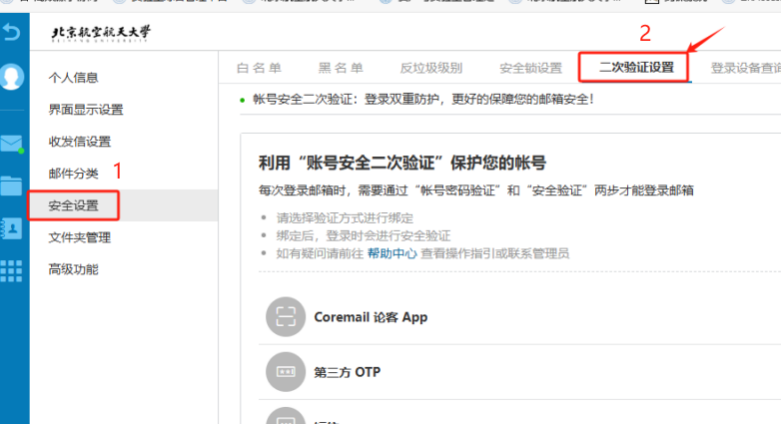 1.进入设置界面:登录网页端邮件系统,点击左下角齿轮形“邮箱设置”按钮。选择左侧菜单中的“安全设置”,点击右侧主界面上方“二次验证设置”选项卡。